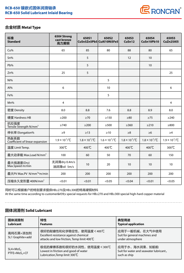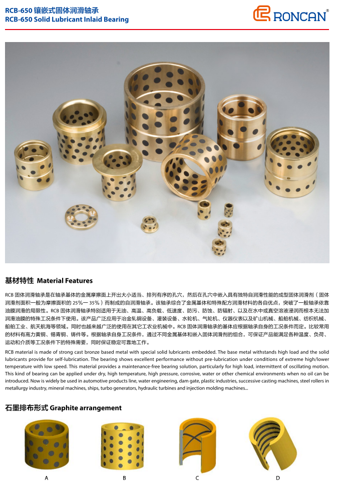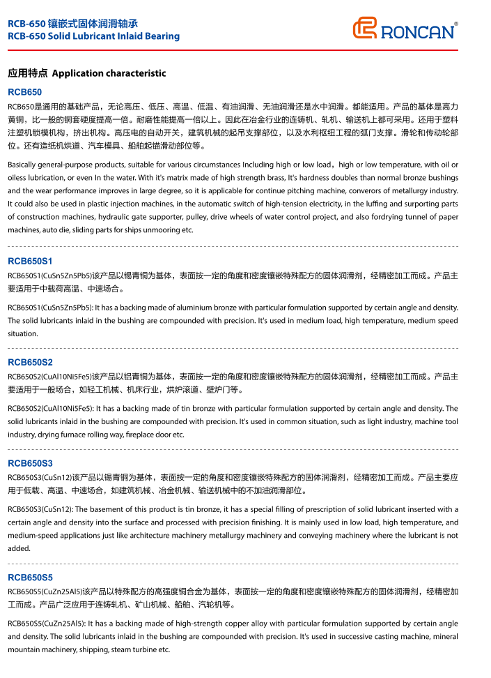 RCB650是通用的基礎產(chǎn)品,無論高壓、低壓、高溫、低溫、有油潤滑、無油潤滑還是水中潤滑。都能適用。產(chǎn)品的基體是高力黃銅,比一般的銅套硬度提高一倍。耐磨性能提高一倍以上。因此在冶金行業(yè)的連鑄機、軋機、輸送機上都可采用。還用于塑料注塑機鎖模機構(gòu),擠出機構(gòu)。高壓電的自動開關(guān),建筑機械的起吊支撐部位,以及水利樞紐工程的弧門支撐。滑輪和傳動輪部位。還有造紙機烘道、汽車模具、船舶起錨滑動部位等。